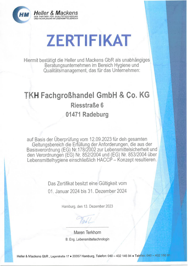 Um den neuesten Anforderungen gerecht zu werden ist unser Betrieb seit 2005 HACCP zertifiziert und erhielt 2007 das Zertifikat für ökologisch erzeugte Lebensmittel.
